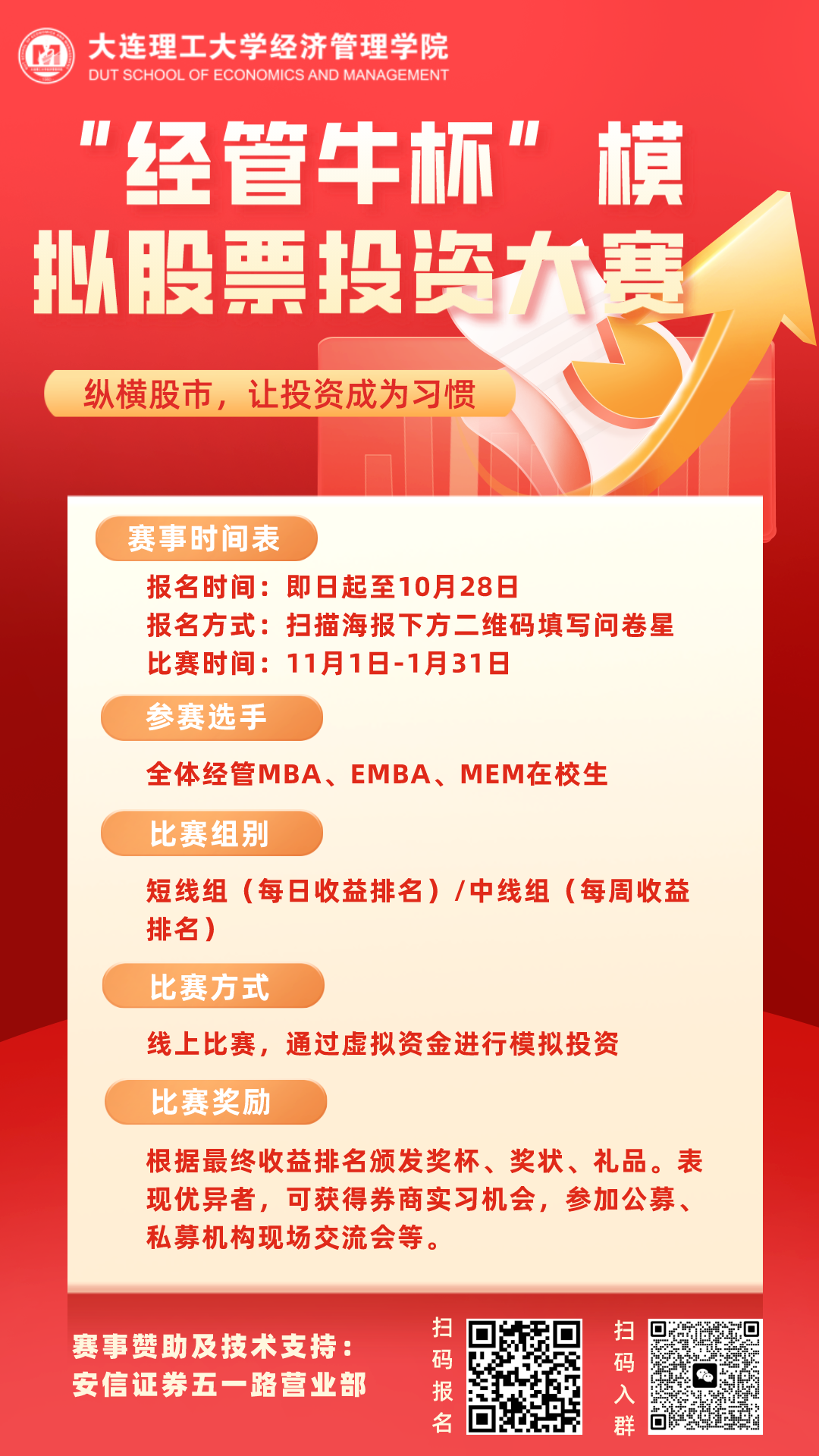 近年来,资本市场在我国社会主义市场经济中的地位越来越重要、证券类资产占我国居民资产投资的比重也越来越高。随着北京证券交易所成功设立,新三板改革继续深化,中国特色的资本市场正朝着更加市场化、法制化、国际化的方向发展。为丰富同学金融知识与投资经验,使同学了解资本市场、熟悉证券投资、提高风险管理意识,同时与MBA相关课程结合,通过实践巩固所学知识,特举办首届“经管牛杯”模拟股票投资大赛。本次比赛由MBA联合会主办,安信证券提供赛事赞助及技术支持。
