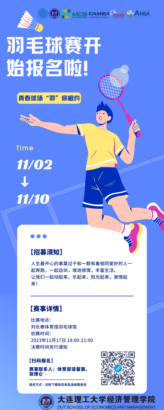 各班级由体委或指定人员作为本次羽毛球赛班级负责人,负责组织报名、收集信息并按要求反馈报名表至指定邮箱dut_tiyubu@163.com,邮件以【羽毛球赛+班级】命名,例:羽毛球赛2023级MBA1班。