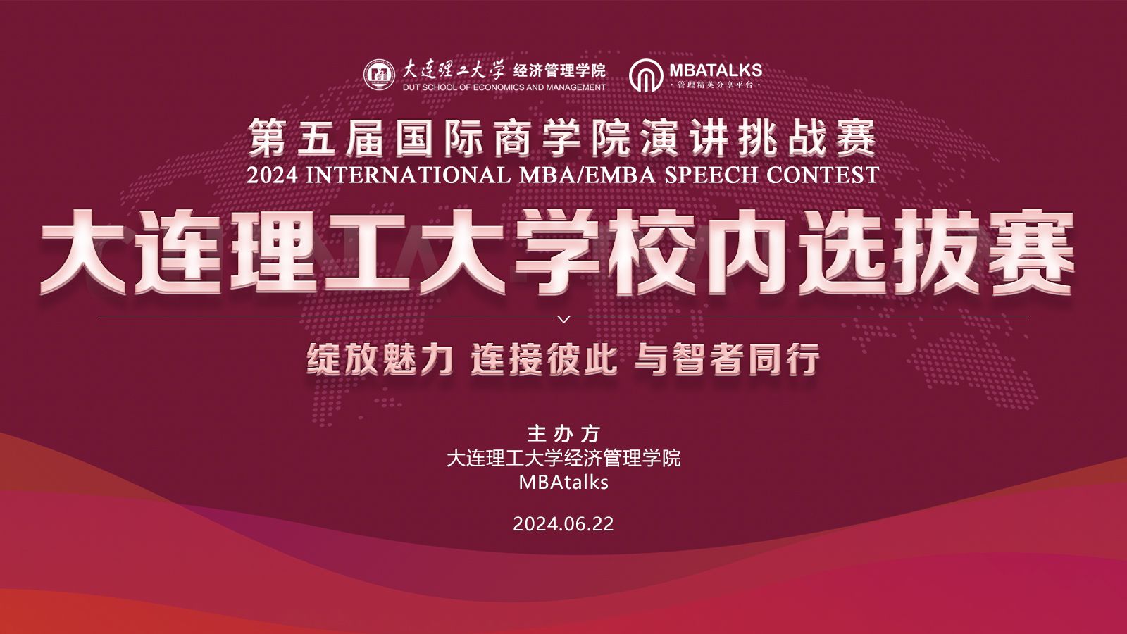 国际商学院演讲挑战赛(简称“国演赛”)是由管理精英分享平台MBAtalks发起,在海内外商学院学生群体中开展的一项演讲社交式文化赛事,也是中国商学院最大规模演讲比赛。比赛秉承“与智者同行”的核心理念,倡导(E)MBA人通过演讲“绽放魅力,连接彼此”。本届赛事分为3个阶段:校内选拔赛、赛区总决赛、全国总决赛。东北赛区总决赛将于7月13日在大连理工大学经济管理学院举办。