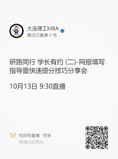 为了帮助大家顺利度过这一关键时期,大连理工大学MBA联合会学习部特此举办“研路同行 学长有约(二) —— 网报填写指导暨快速提分技巧分享会”。我们荣幸地邀请到了两位资深老师,他们将详细解读最新的招生政策与报考流程;同时,还将有两位成功在短时间内提升成绩并顺利上岸的学长,分享他们的优选计划与宝贵备考经验。