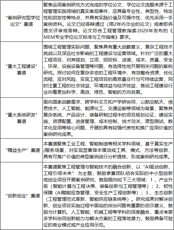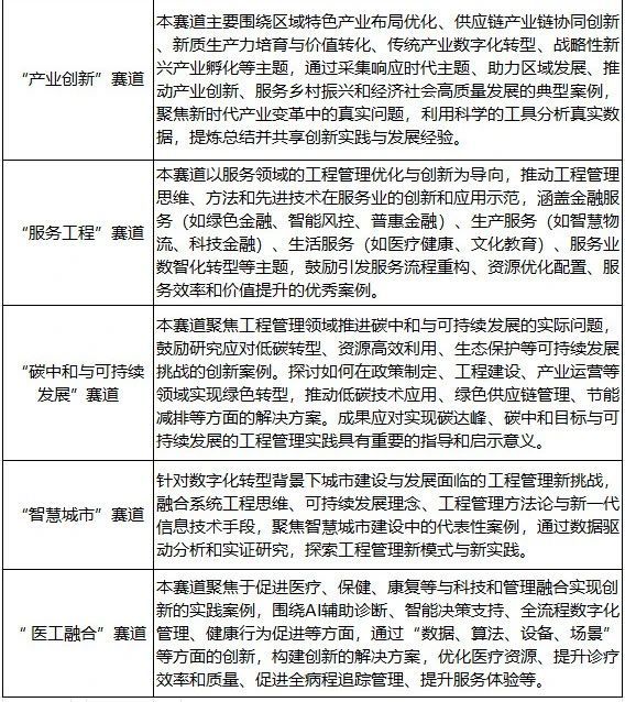 本届大赛设10个平行主题赛道。参赛作品应紧密围绕工程管理实际问题,选题具有典型性、特定性和示范性,成果具有较高的启示价值;参赛者可参考各个“主题赛道”介绍,投稿到相应的“主题赛道”,每个案例只能投稿1个“主题赛道”。