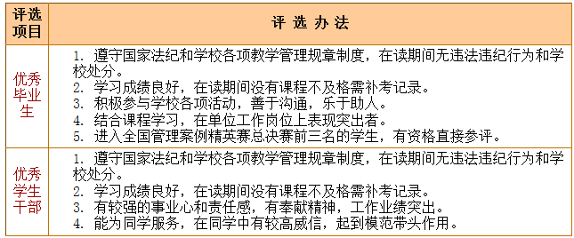 1.总结专业学位硕士学生在读期间的学习成效,对课程学习成绩优秀,并在实践课程大赛或全国管理案例精英赛中取得优异成绩的学生予以肯定及表彰。