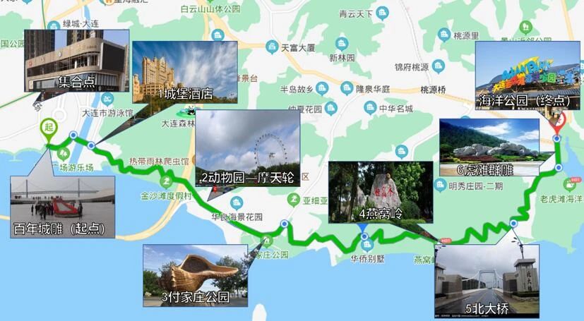 星海广场(始发)---滨海路---付家庄公园---燕窝岭---北大桥---老虎滩海洋公园(终点)
