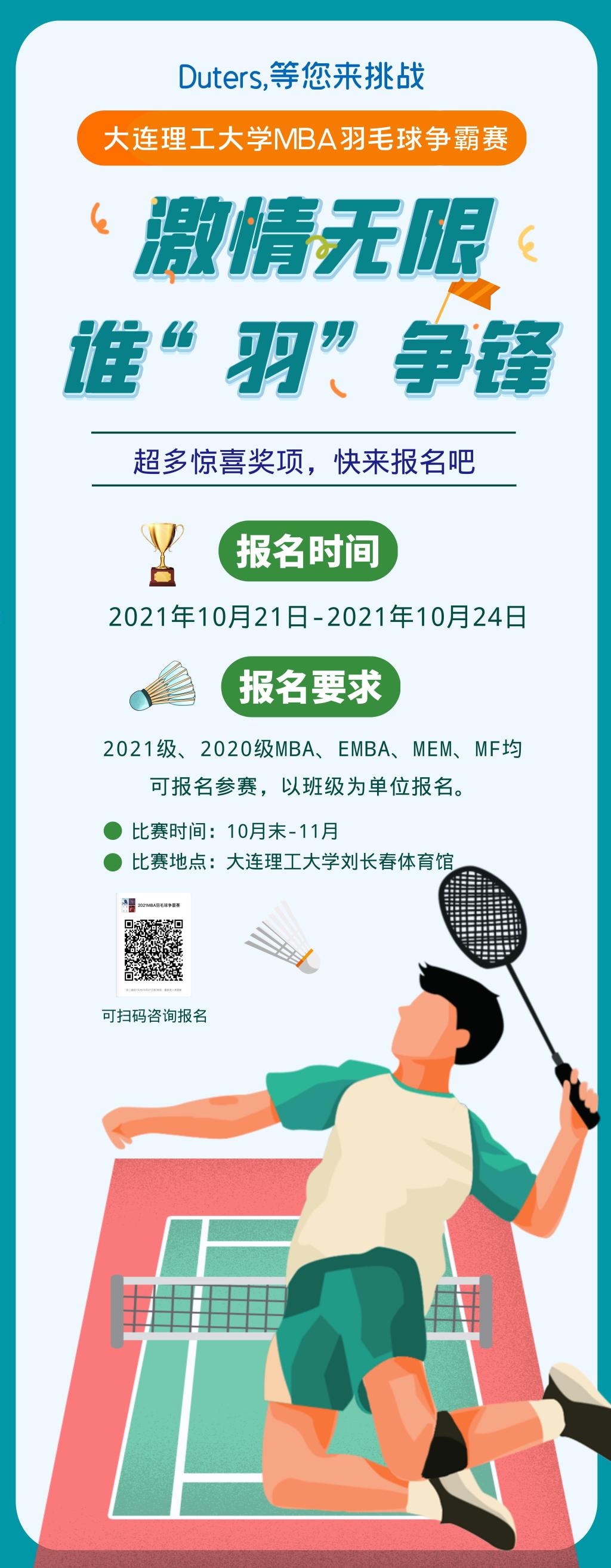 激情无限,精彩不断。为丰富大连理工大学MBA同学们的文体生活,培养集体荣誉感和团队精神,形成良好的班级向心力和凝聚力,展示同学们的团结、和谐、勇于拼搏的精神风貌。第十九届MBA联合会拟于10月末至11月开展MBA/EMBA/MEM/MF“谁羽争锋”羽毛球争霸赛,超多惊喜大奖等着您,赶快来报名吧