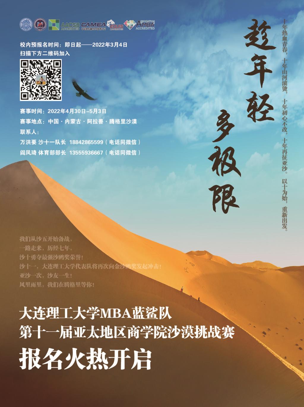 赛事介绍:亚太地区商学院沙漠挑战赛是亚太地区顶级商学院户外赛事。首届赛事于2012年在内蒙古阿拉善盟腾格里沙漠举行,已连续成功举办十届,参与院校120余所,直接参与赛事MBA学生已超过1.5万人,覆盖100万以上亚太地区商学院群体。
