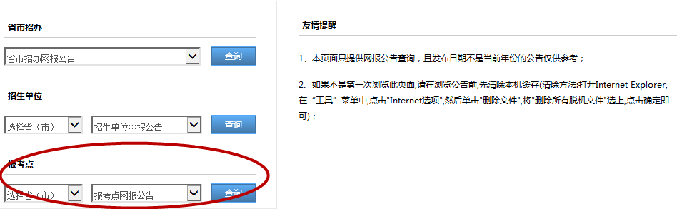 第三步:点击报考点下面的省/(市)和报考点网报公告之后查询