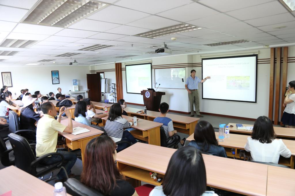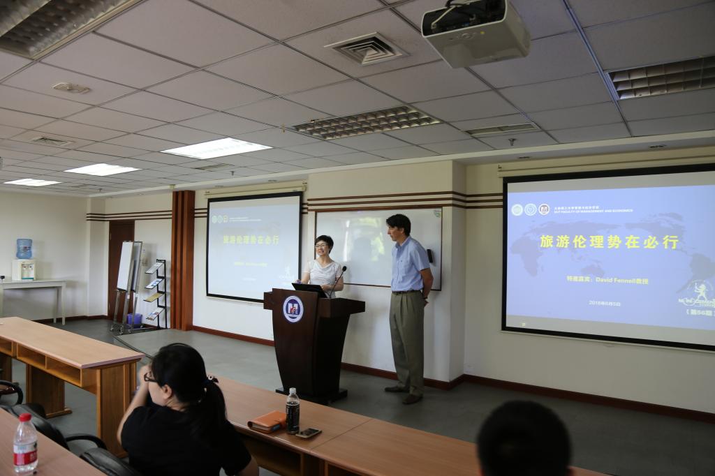 没听讲座之前,大家很容易将旅游伦理与不文明旅游行为混淆,认为二者似乎是一回事。但是,来自加拿大布鲁克大学旅游与环境管理系的David Fennell教授和我校旅游与环境管理研究所肖贵蓉副教授联袂合作,让我们进行了一场更具思辨性、更深广的旅游伦理思考。