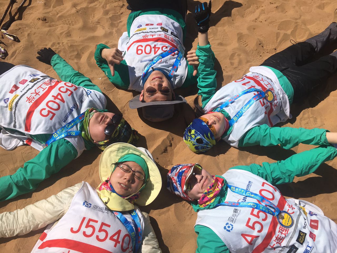 第一天的路程好像远不是官方数据的26公里,而像是31公里,我们的队员很多没能在各点关门时间前到达,无缘有效成绩,而被迫中断了比赛。12名队员仅剩5名幸存,战斗很惨烈的,我们有点儿弱。第一天,说是抚摸沙漠,其实是被沙漠无情摧残了——肉体+精神。
